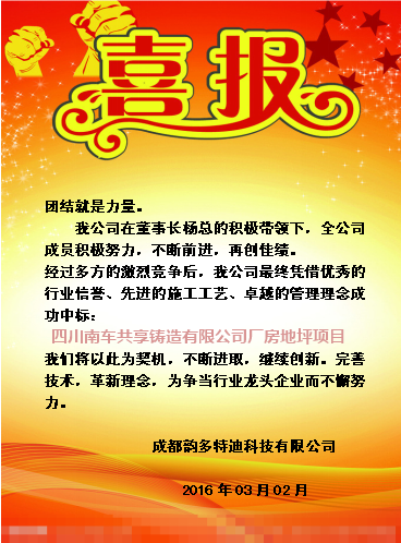 喜报 我公司成功中标南车共享铸造有限公司厂房地坪项目