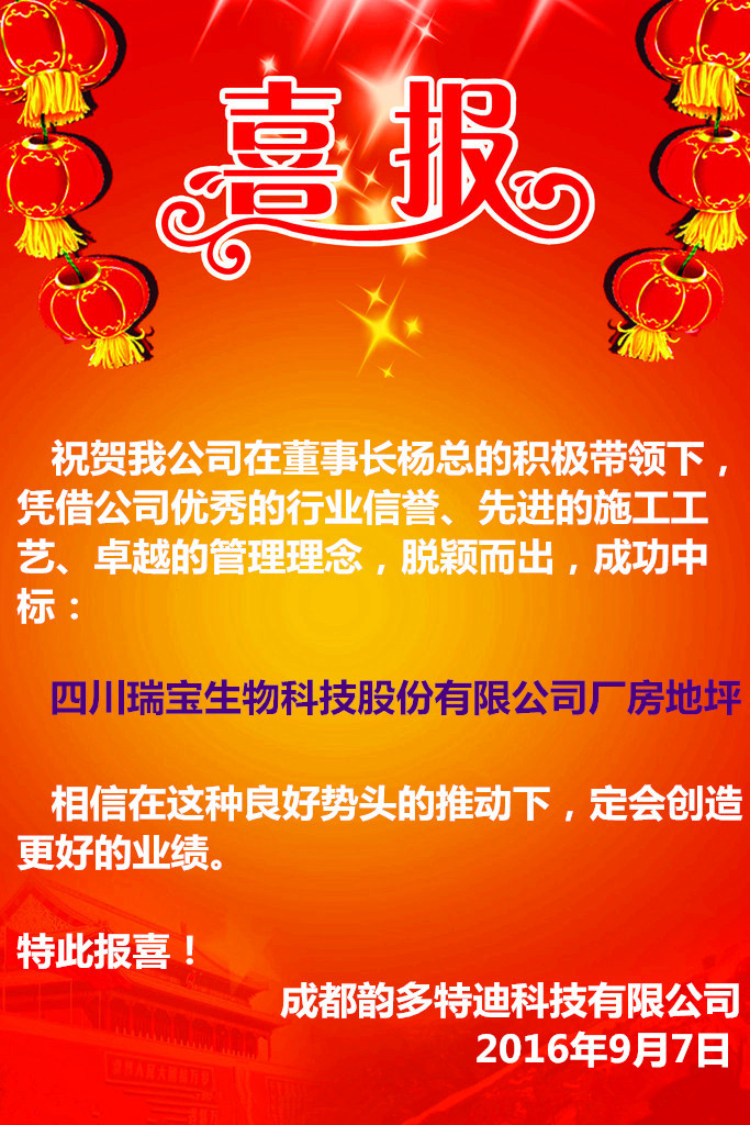 喜报 我公司成功中标四川瑞宝生物科技股份有限公司厂房地坪项目