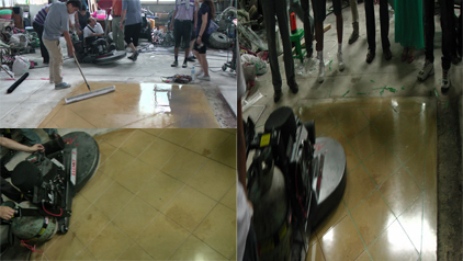 由美国总部派来支持无锡华灿的Damian先生,一如既往地以其丰富的经验和热情感染了与会嘉宾。Damian先生此次从客户的需求、市场的发展,延伸至RetroPlateSystem – 力石伯乐商业地坪领先的研磨抛光工艺和环保理念,在现场实例演示了如何帮忙客户解决问题、满足客户的实际需求。同时,RP推广部经理通过PPT的演示,向嘉宾展示了我司在国内已完成的项目,以及我司已具备的施工能力和积攒的经验。接下来的时间,通过现场的实地施工样板,国内安斯福团队向嘉宾展示了研磨抛光设备以及整套施工工艺,同时演示了填缝、修补、弧形切割、染色工艺等。